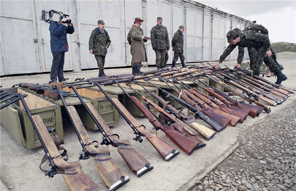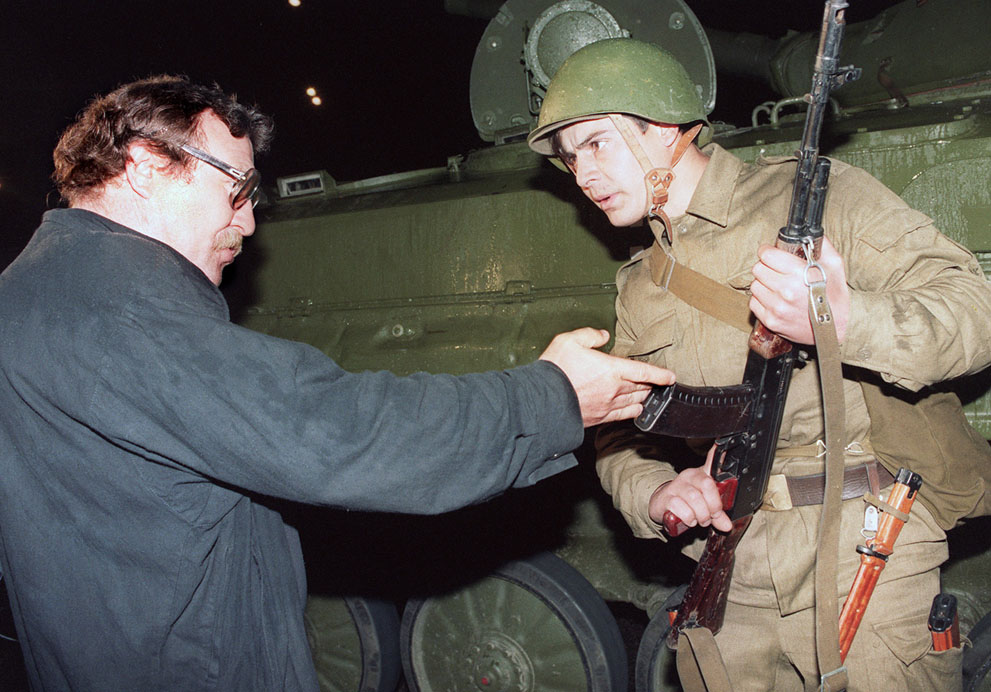 ▲1991年8月31日,立陶宛政府宣布与苏联秘密警察组织克格勃断绝关系后,一名立陶宛官员要求一名克格勃的成员(右)交出武器离开位于维尔纽斯的克格勃总部。