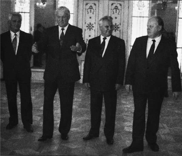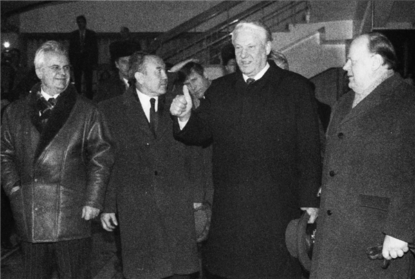 ▲1991年12月21日:叶利钦在阿拉木图。从左往右依次是克拉夫丘克、纳扎尔巴耶夫、叶利钦和舒什克维奇,他们正在庆祝创建独联体来取代苏联。