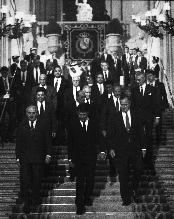 ▲1991年11月1日,戈尔巴乔夫在马德里参加中东会议,这也是他最后一次国际活动,会议期间,他被美国代表看作“已经过气的人”。