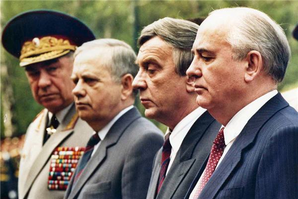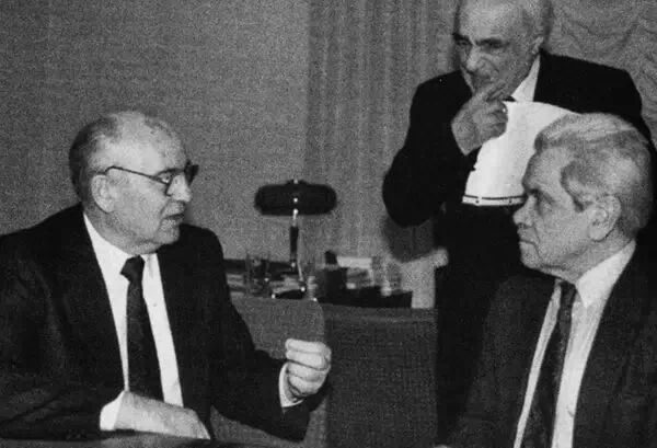 ▲我们应该怎样生存?戈尔巴乔夫与助手阿纳托利·切尔尼亚耶夫(右)和格奥尔基·夏哈纳扎罗夫讨论苏联黯淡无光的未来。