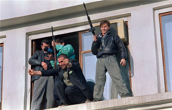 ▲1991年11月14日,在格罗兹尼(俄罗斯车臣—印古什共和国首府)的一次游行集会中,一名兴高采烈的车臣分离主义者向人群张开双臂紧握双拳,庆贺苏联军队从俄罗斯南部的穆斯林地区撤离。