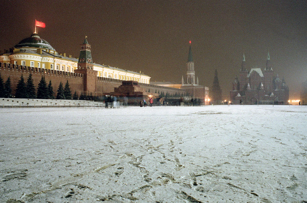 ▲1991年12月21日,星期六晚上,在莫斯科红场,这是苏联国旗在克里姆林宫上空飘扬的最后一段时光了。在新年它将会被俄罗斯国旗所取代。