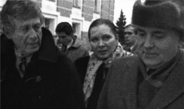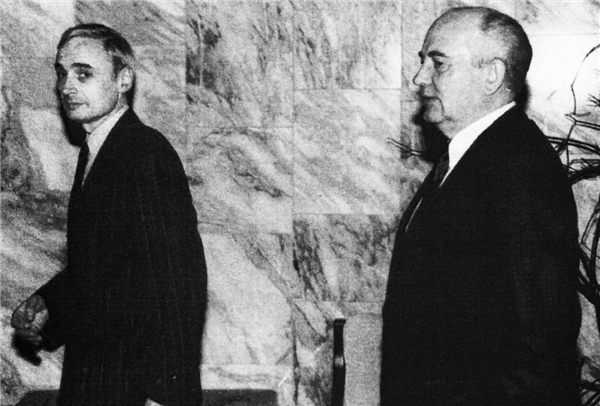 ▲米哈伊尔·戈尔巴乔夫在ABC的泰德·科佩尔的陪伴下走向他在克里姆林宫的办公室。