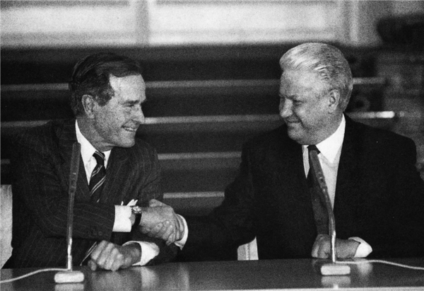▲叶利钦在赢了戈尔巴乔夫之后不久与布什见面,他最终成为世界领导人集团中的一员。