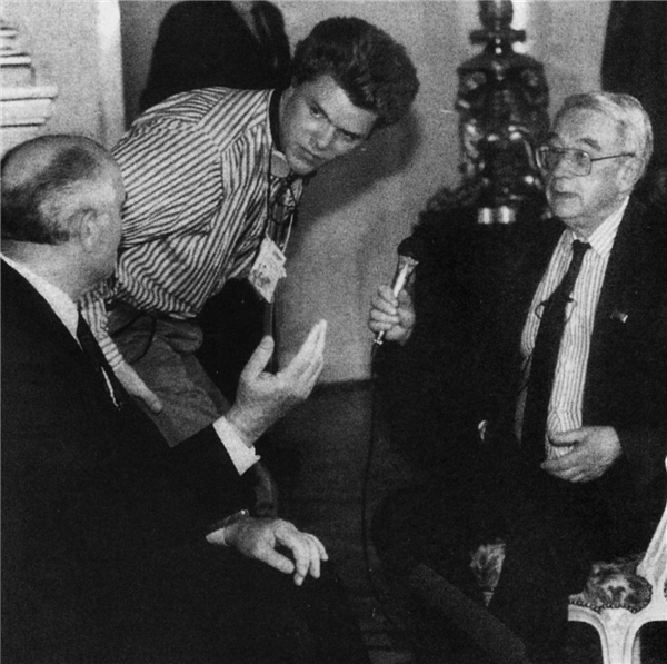 ▲叶戈尔·雅科夫列夫(右)帮助戈尔巴乔夫准备进行辞职后的采访。