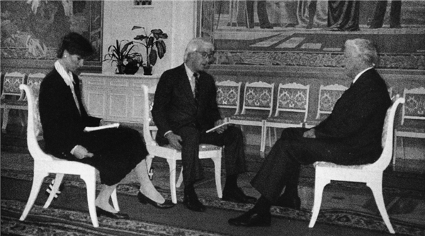 ▲在戈尔巴乔夫的辞职演说即将开始前,克莱尔·席普曼和斯蒂夫·赫斯特采访打扮得一丝不苟、一副胜利姿态的鲍里斯·叶利钦。