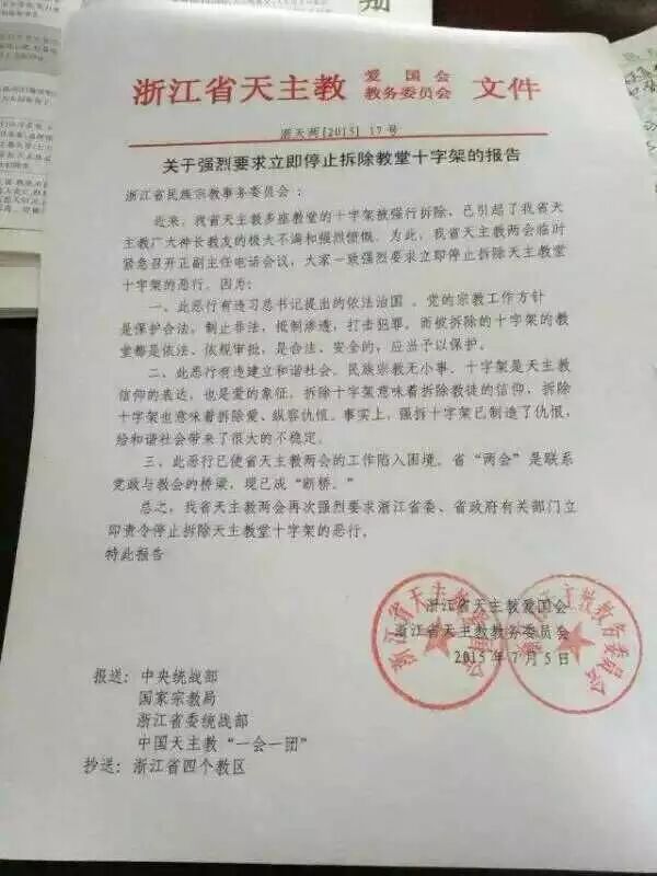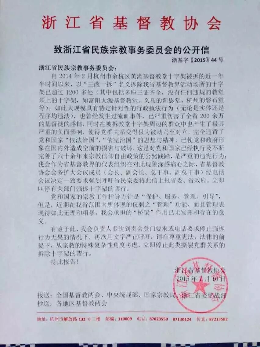 浙江省基督教协会7月10日发布对省民宗委公开信,首次公开声明停止强拆十字架的要求。公开信中提及,自2014年2月份以来的一年半时间以来,以“三改一拆”名义拆除浙江省基督教界活动场所的十字架已超过1200多处。特别指出的是,这些场所中包括三证齐全、没有任何违规的教堂顶部的十字架,如富阳大源基督教堂、义乌新恩堂,以及杭州下沙磐石堂(6月19日拆除)。