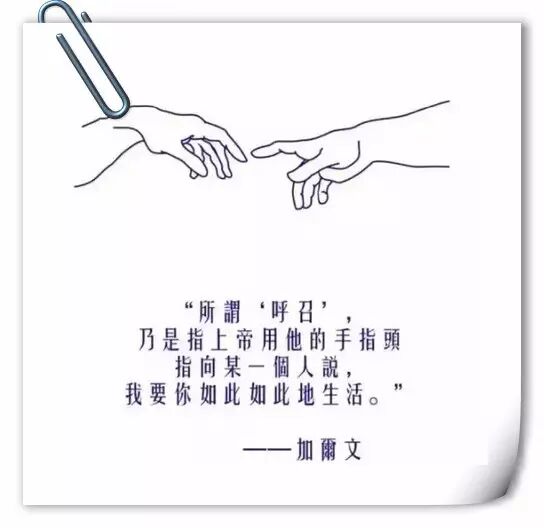 他的配图上,有一句加尔文的名言:所谓“呼召”,乃是指上帝用祂的手指头指向某一个人说,我要你如此如此地生活。