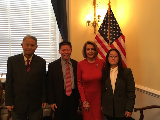到国会时,由于本届国会只剩任期最后2天,在百忙中众议院少数党领袖前议长现民主党领袖南希佩洛西在她的办公室特别与傅牧师一行人见面并合影。她非常关心江天勇律师的下落,她承诺会将金变玲给奥巴马总统和克里国务卿的呼吁信转交,傅牧师也公开呼吁美国各方向中国施加影响,
