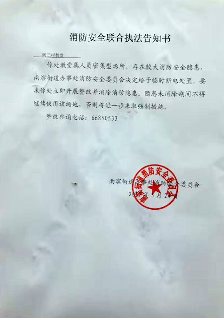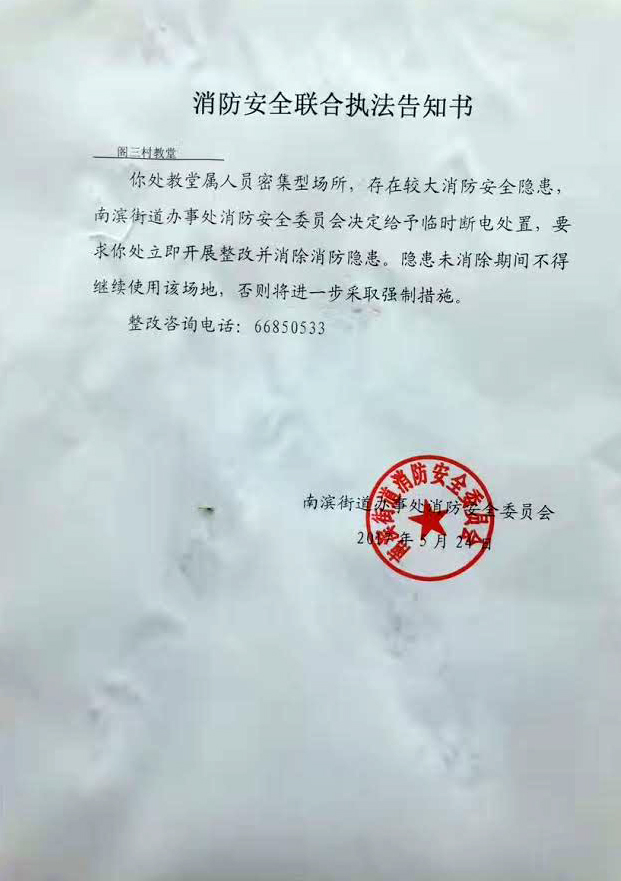 阁三村教堂收到的该份名为《消防安全联合执法告知书》称,“你处教堂属人员密集型场所,存在较大消防安全隐患,南滨街道办事处消防安全委员会决定给予临时断电处置,要求教堂立即开展整改并消除消防隐患。隐患未消除期间不得继续使用该场地,否则将进一步采取强制措施”。该告知书落款是南滨街道办事处消防安全委员会。