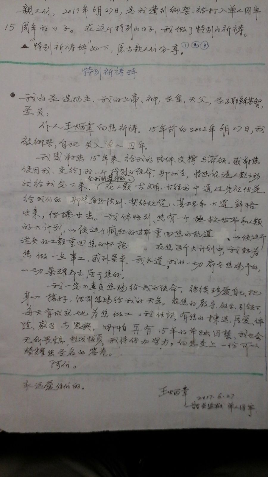 王金环说︰王炳章通过对圣经的感悟,他想向在外面的朋友们表示,他原谅那些曾经伤害过他的人,包括那些特务,诱捕他,绑架他,诋毁他,攻击他的那些人。王炳章也在狱中替他们祈祷,希望主耶稣能引导他们走向正路。