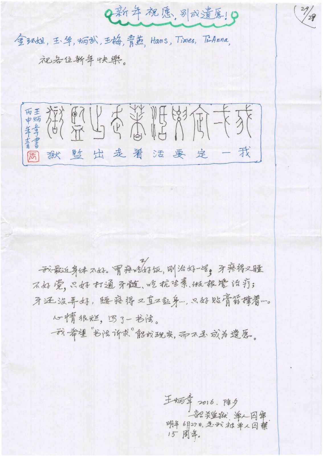 民主人士魏京生先生说: “王炳章到现在还被关在监狱里令人非常遗憾,他现在岁数也很大了,而且他所在监狱的条件非常的差。他已经遭受了很大的折磨,据说现在身体非常不好。我们一定要进一步的呼吁,并想办法获取他早日出狱。”