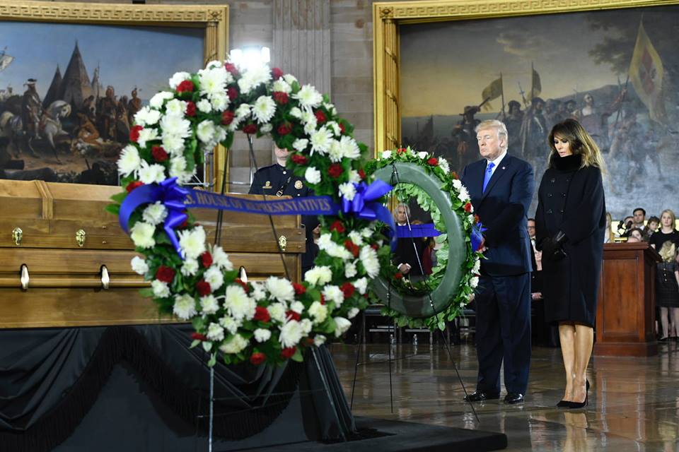 | 川普总统向葛培理牧师灵柩敬献花圈 (图:葛福临牧师脸书,2018年2月28日) |