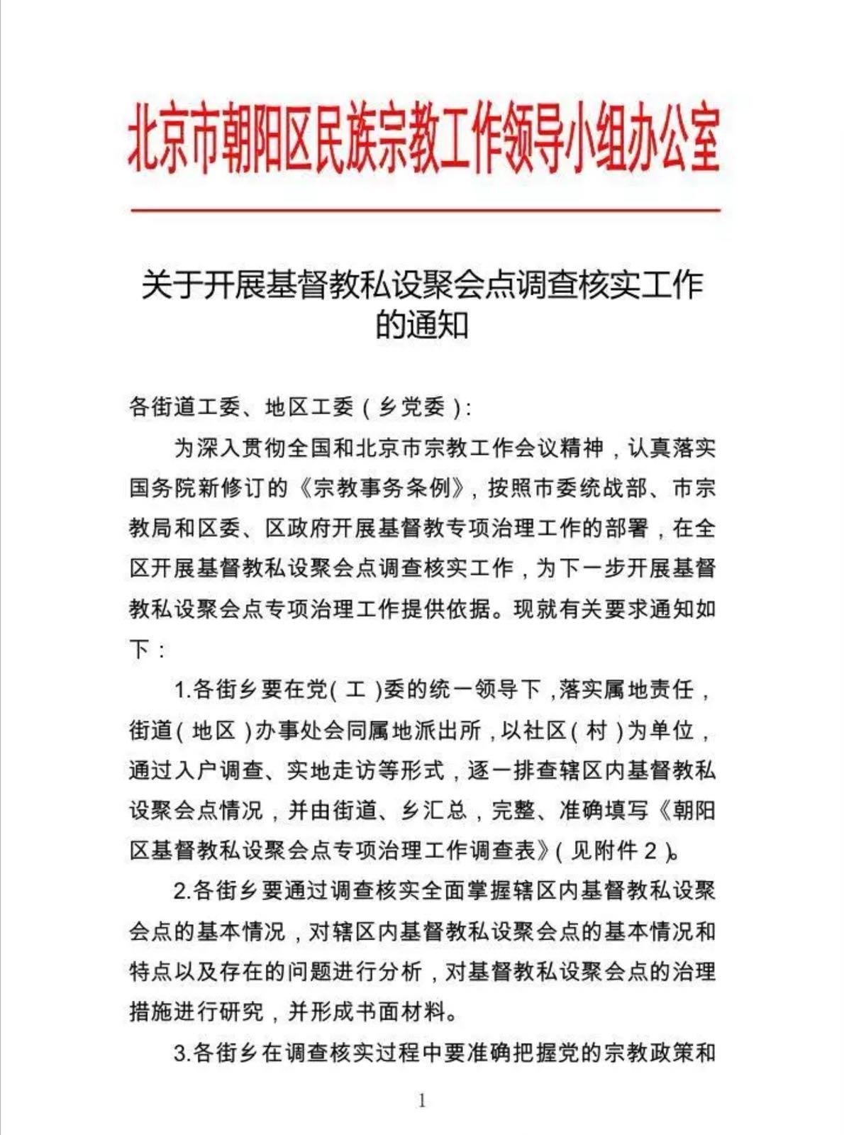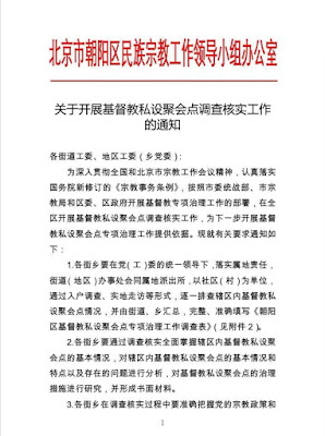 (北京-2018年4月30日)北京市朝阳区民族宗教工作领导小组办公室在3月16日向其下属颁布一份通知,要求各街道对朝阳区辖区内的基督教家庭教会进行摸底调查,并形成书面材料,为“专项治理”打下坚实基础。
