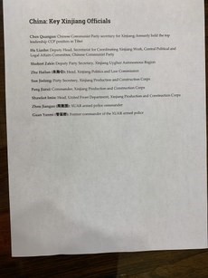 4名宗教活动人士向彭斯提交的根据《马格尼茨基人权问责法案》的9人制裁名单,包括新疆自治区书记陈全国及其他在新疆推行集中营、进行人权迫害的新疆官员。(吴亦桐提供)
