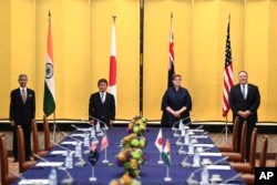 | 印度外长苏杰生、日本外相茂木敏充、澳大利亚外长佩恩 和美国国务卿蓬佩奥在东京举行四方会谈。(2020年10月6日) |